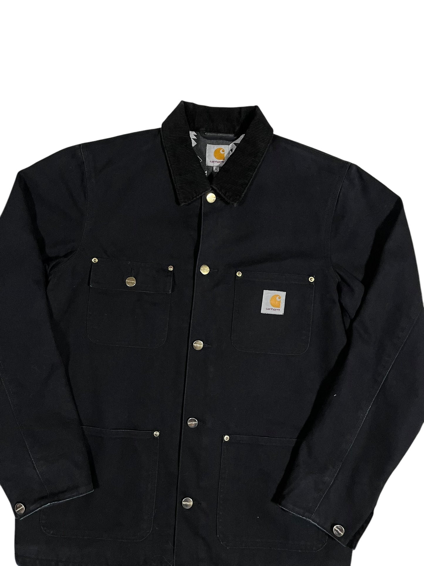 Vintage Carhartt Michigan Jacket in a black colour way. 4 pockets and button fastening. Corduroy collar and classic Carhartt square badge to the chest. Rare Aztec lining.