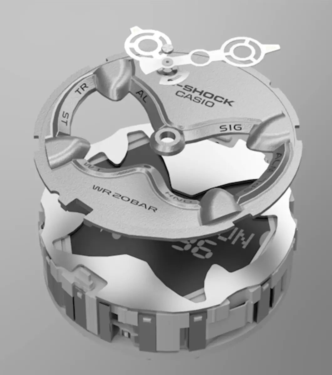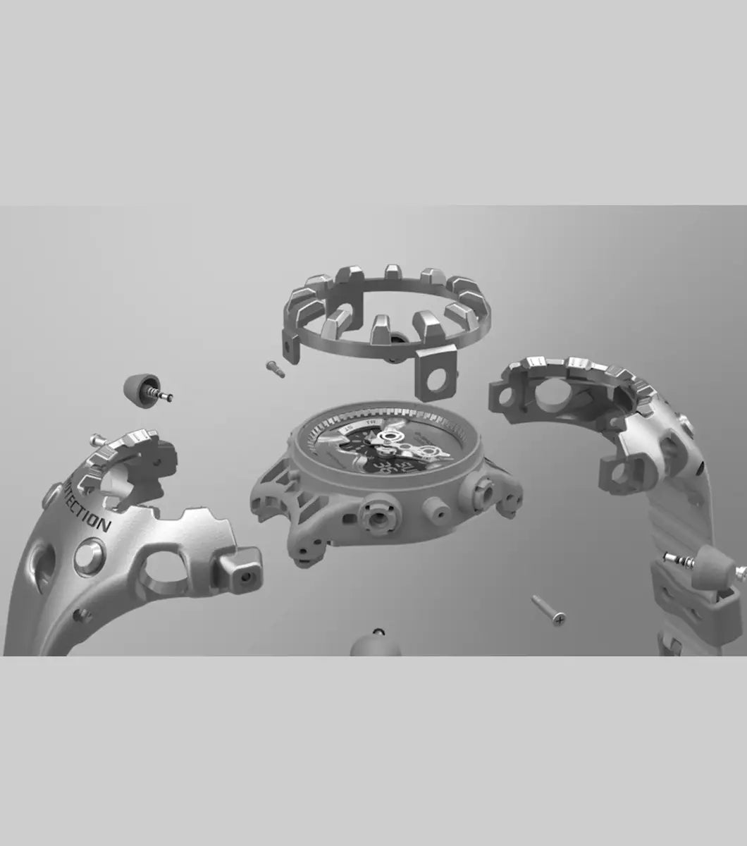 At its core, the watch’s module is securely housed within a centre case, reinforced by an integrated bezel and band structure. Large, dimensional indexes double as shock-absorbing bumpers, delivering a distinctively powerful look while embodying G-SHOCK’s legendary durability.
