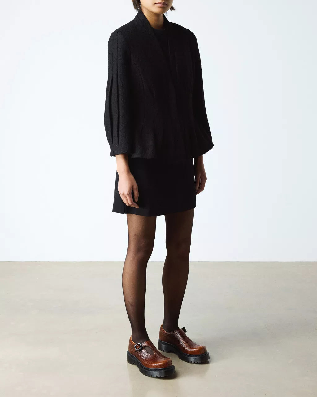 This new style from Dr. Martens swaps its rounded bump toe for a sleek, square new form. Expertly crafted from Analine leather embossed with a crocodile skin design. The asymmetric shoe is fitted with a single buckle and off-center cut out for a refined silhouette. Set on an extra height Bex sole in smoke with a black welt stitch.