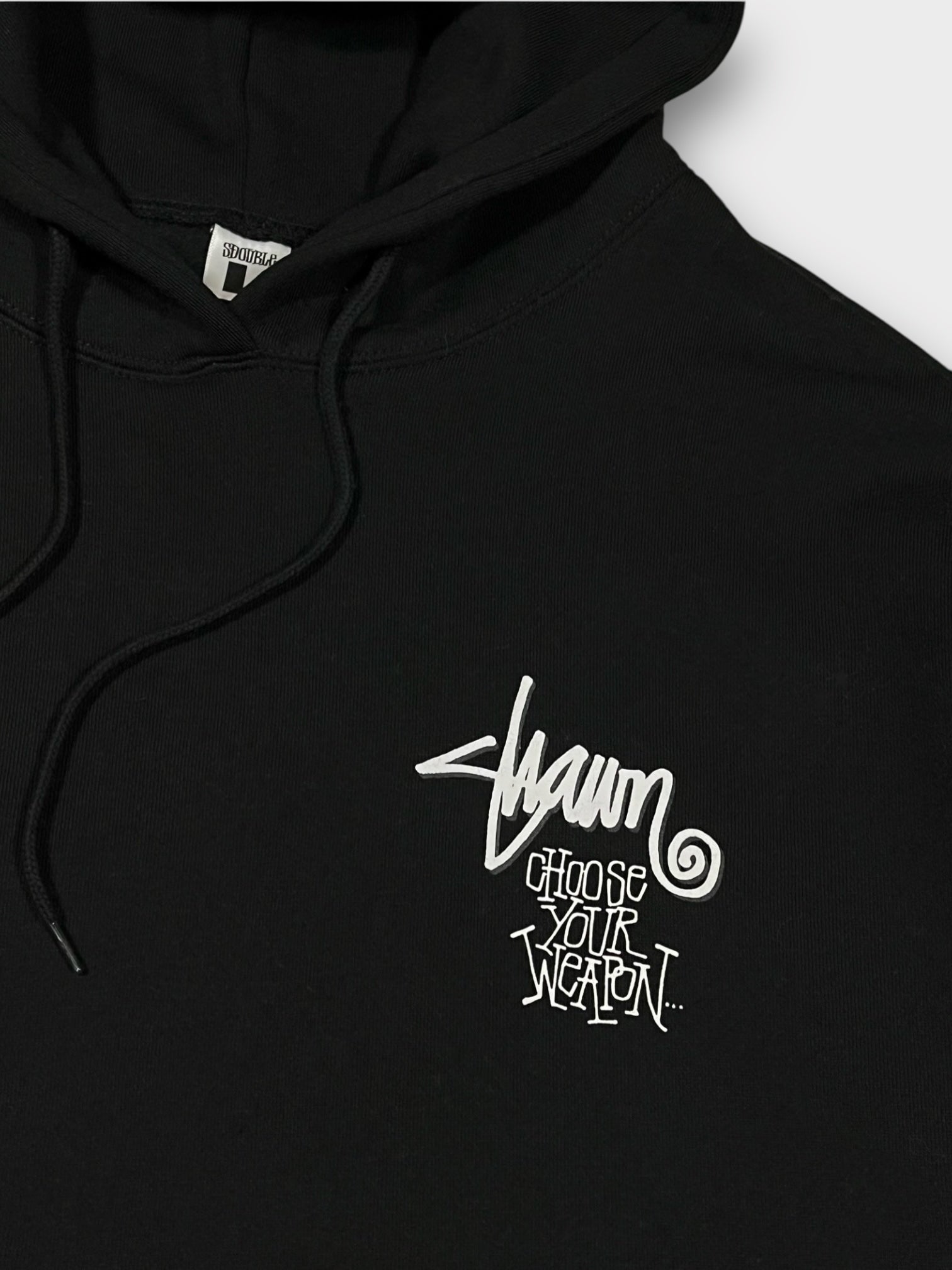 Brand new S Double Hooded Sweatshirt with “choose your weapon” screen-print to the chest and back.