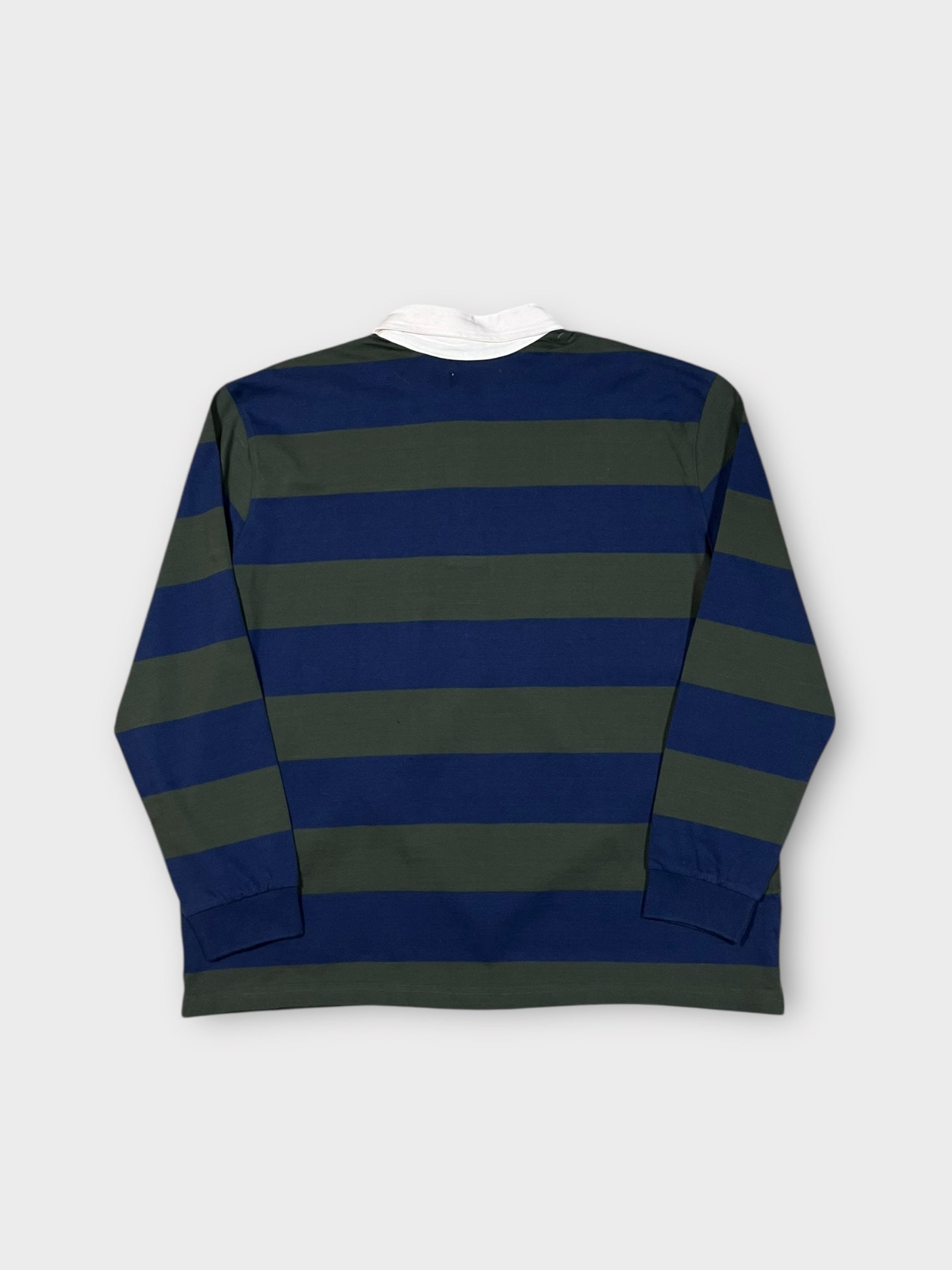The brand new S Double striped rugby shirt comes in a tonal navy blue and forest green.
